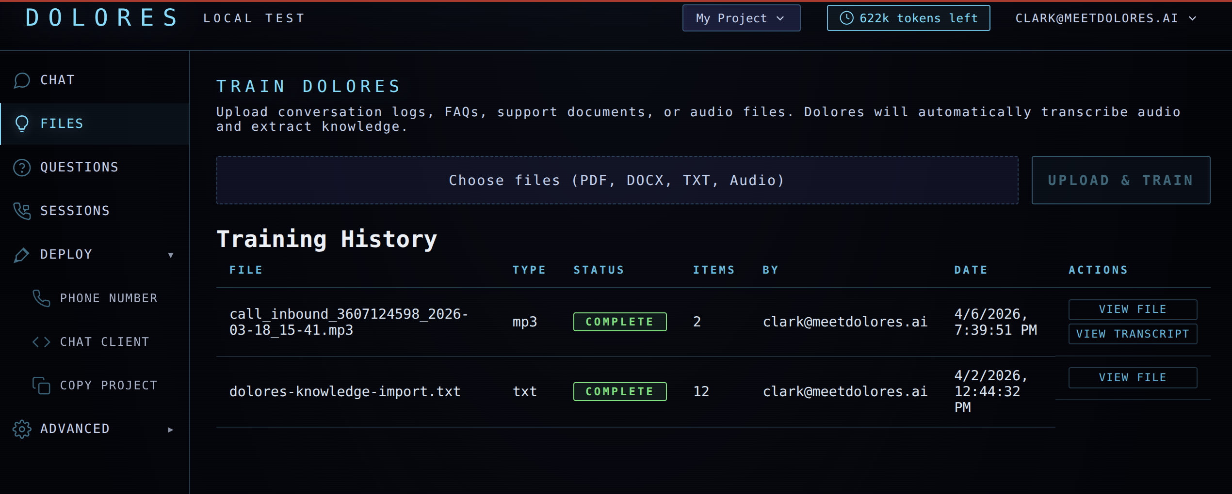 Upload chat logs, FAQs, and audio. Review what Dolores learned. Deploy a phone number or chat widget — all in one place.